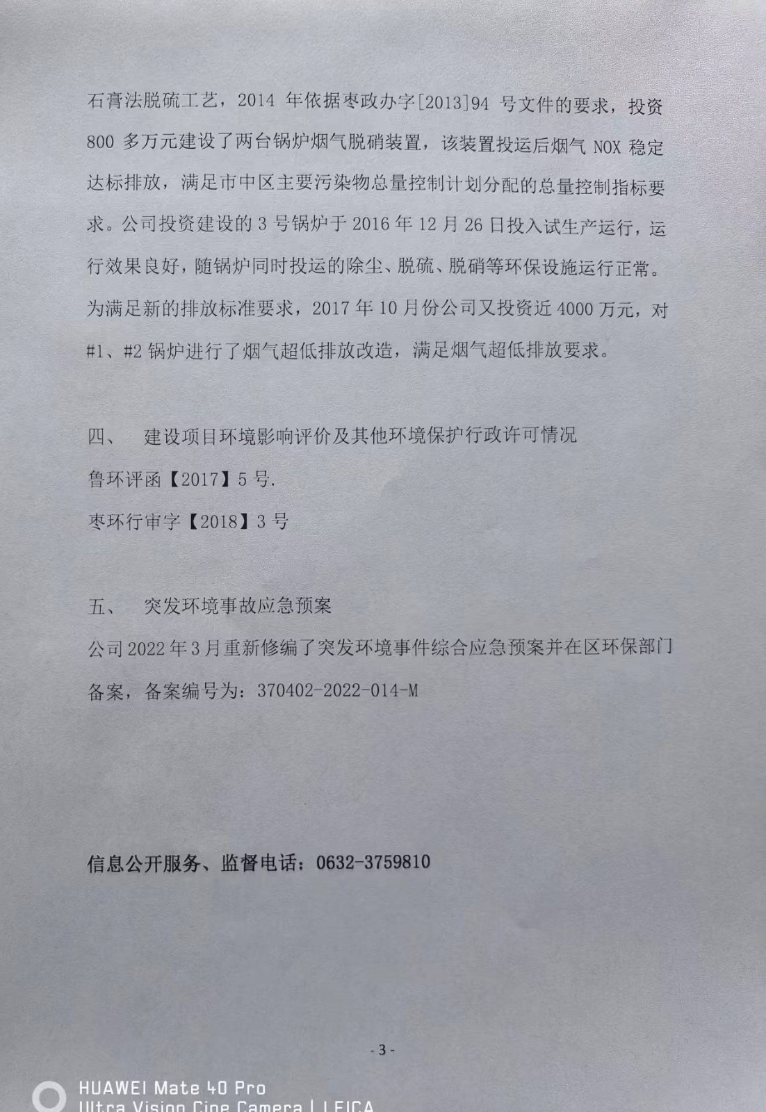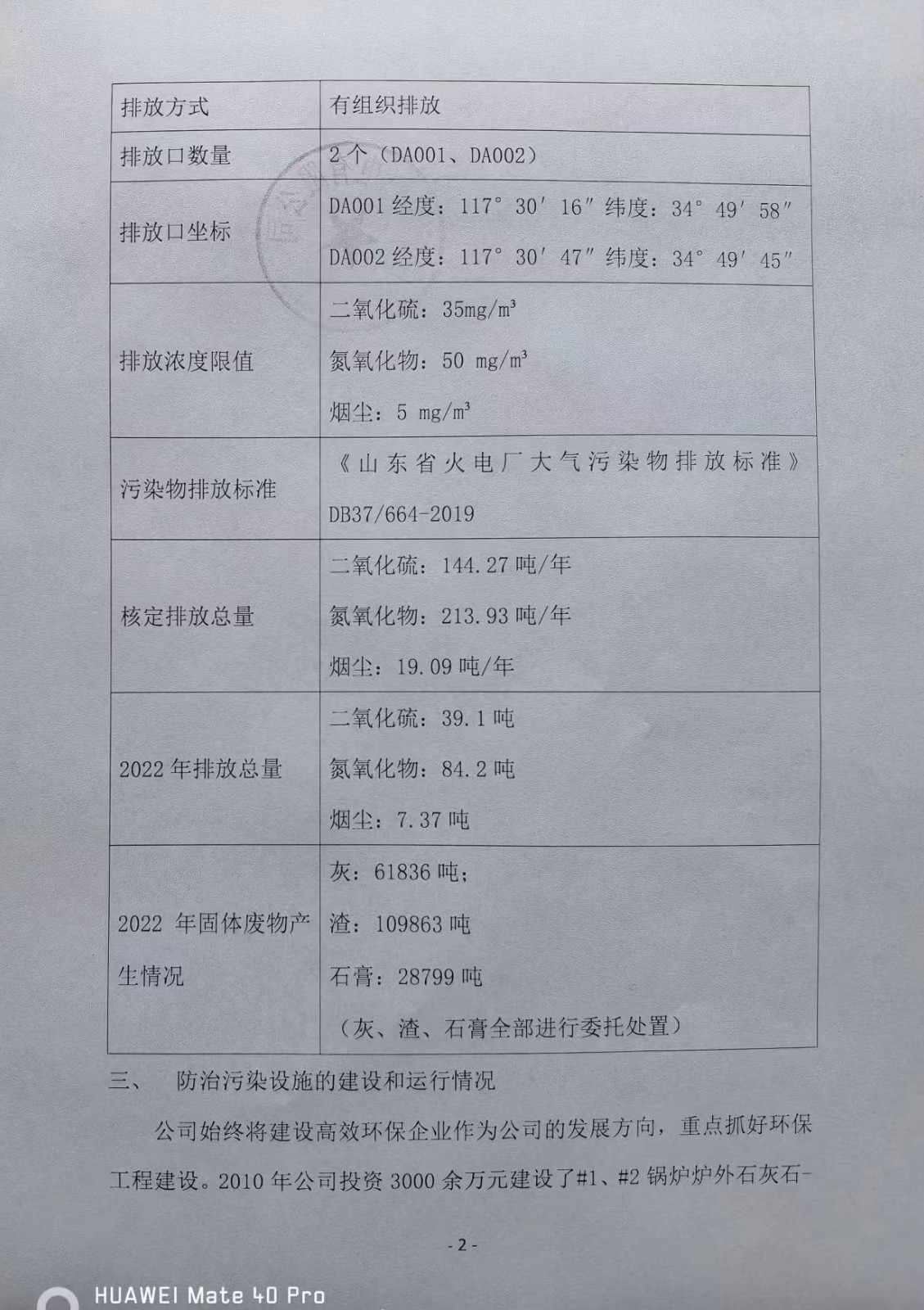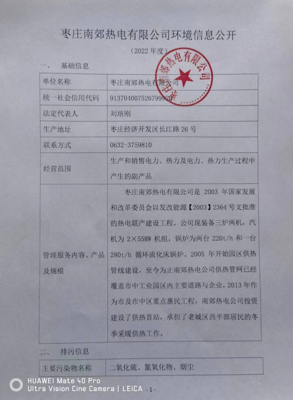 枣庄南郊热电环境信息公开(2022年度)